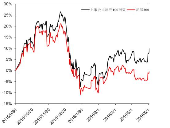 通过将这100只股票采用市值加权的方法构建“漂亮100指数”,如图1所示,自2015年9月30日至2016年6月30日三个季度内,虽然经历熔断冲击导致市场大跌,但漂亮100指数同期涨幅高达11.30%,与同期沪深300指数-1.53%跌幅形成鲜明对比,说明漂亮100指数在此期间取得了12.83%的超额收益。特别是2016年3月以来,漂亮100指数和沪深300指数的差异化表现越来越明显,反映了漂亮100投资组合先于沪深300指数所代表的主体资本市场深度调整完成,其各行业上市公司的创值能力正在不断增强。